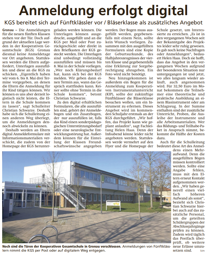 Anmeldeverfahren für Jahrgang 5 – Bericht aus der LDZ vom 24.04.2020