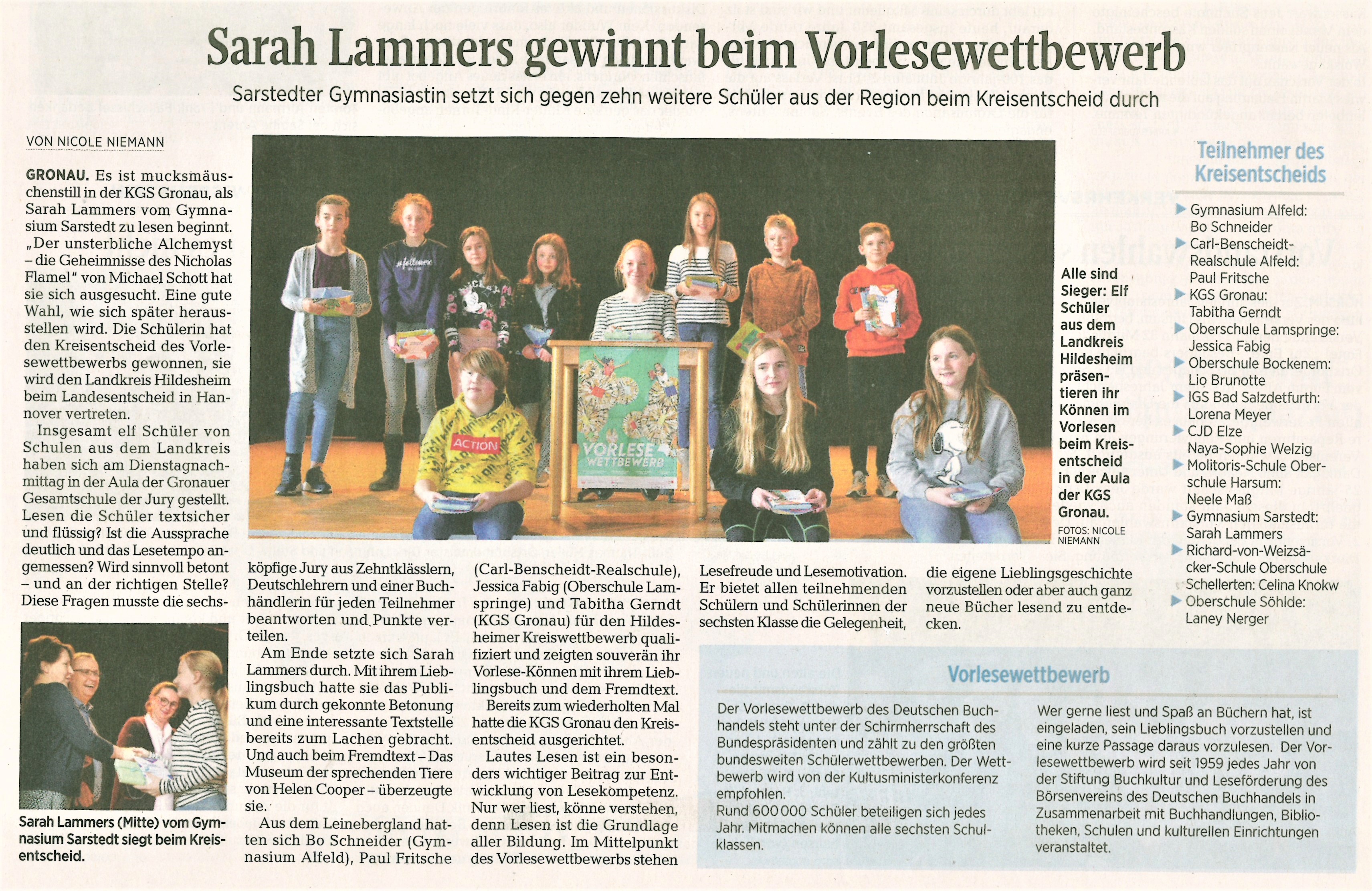 Kreisentscheid Vorlesewettbewerb – Bericht aus der Alfelder Zeitung vom 19.02.2020