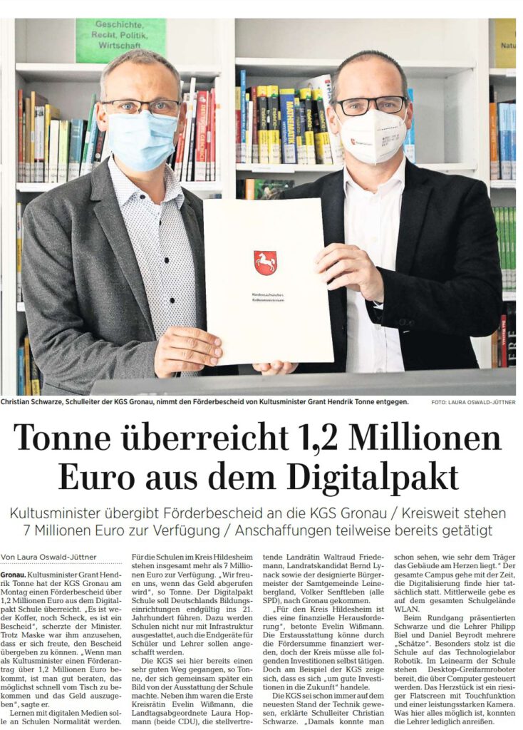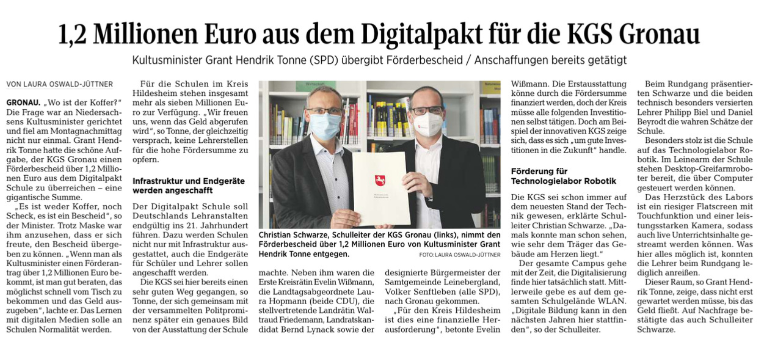 Kultusminister Tonne überreicht 1,2 Millionen Euro aus dem Digitalpakt – Berichte aus der LDZ, HAZ und Alfelder Zeitung