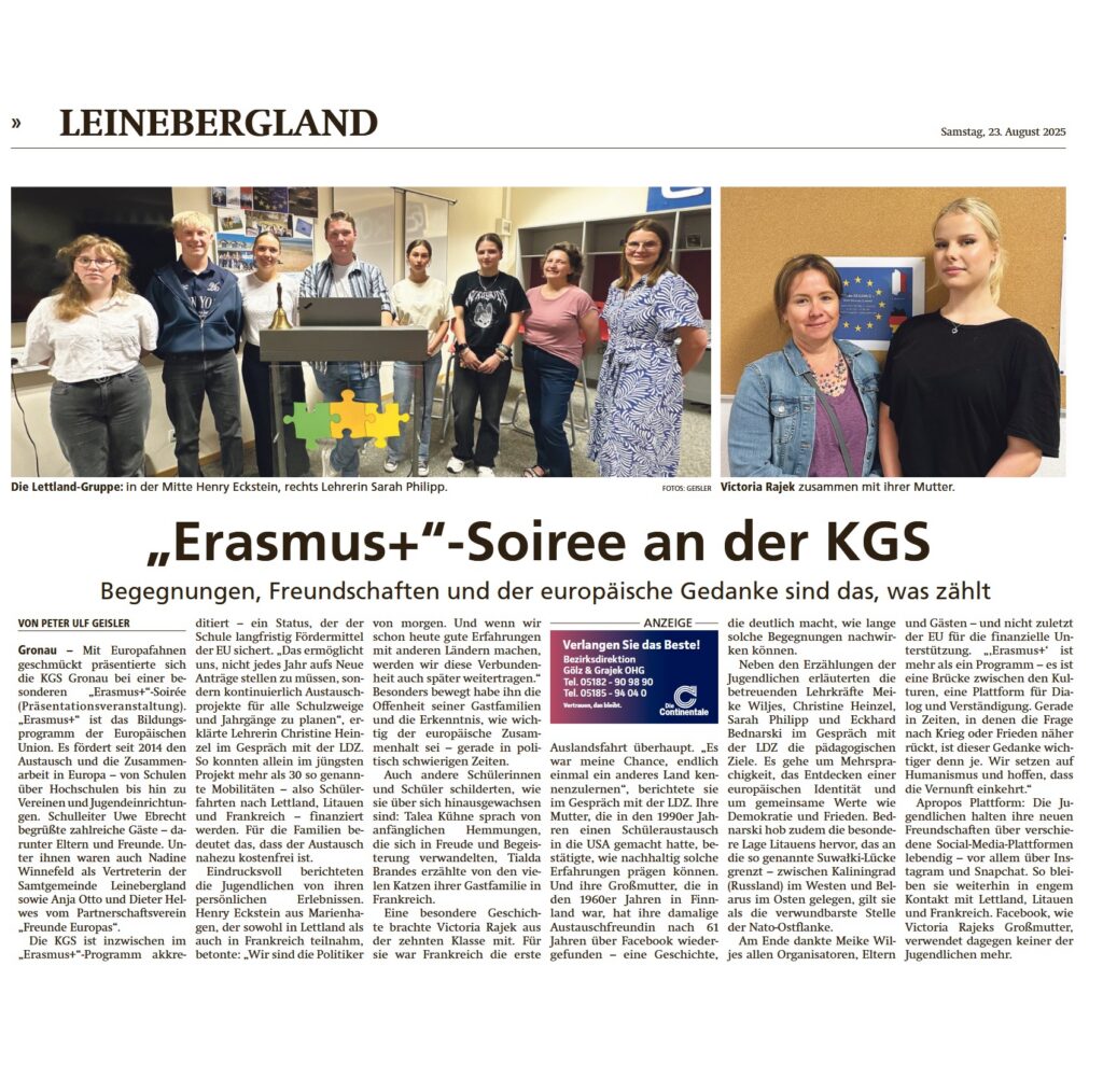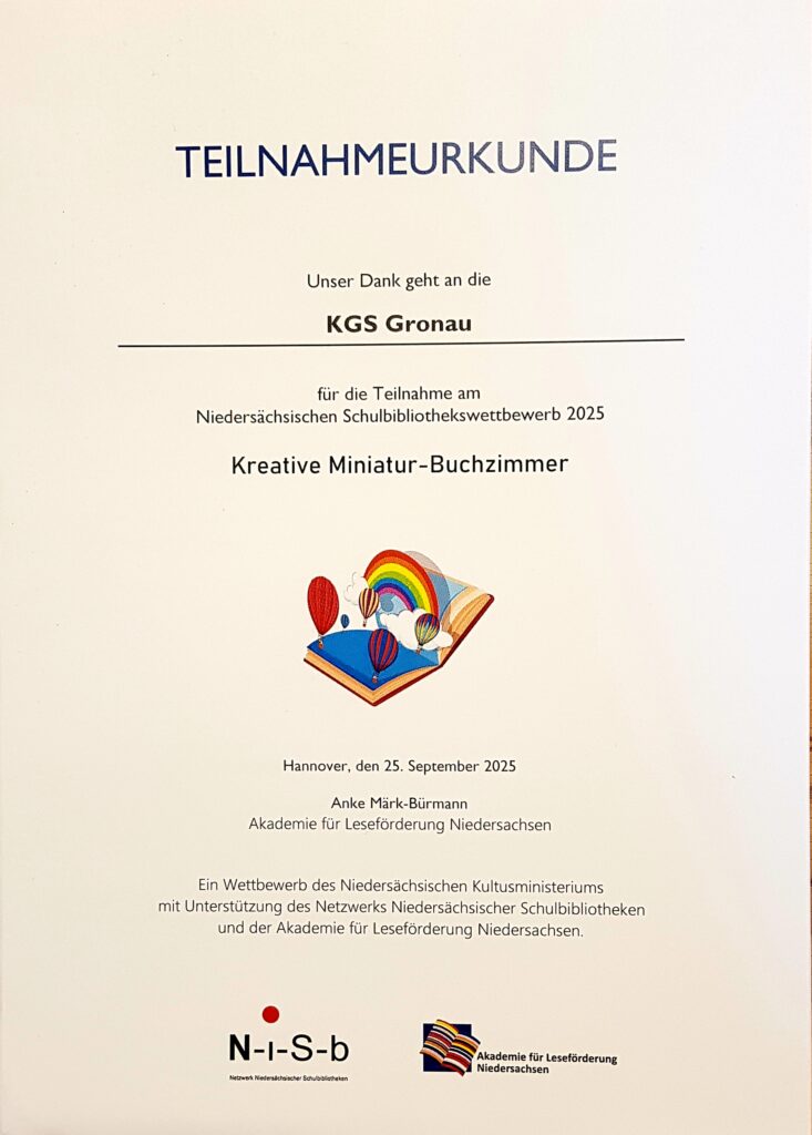 Die KGS Gronau hat in diesem Jahr am Niedersächsischen Schulbibliothekswettbewerb teilgenommen und dafür eine Urkunde von der Akademie für Leseförderung…