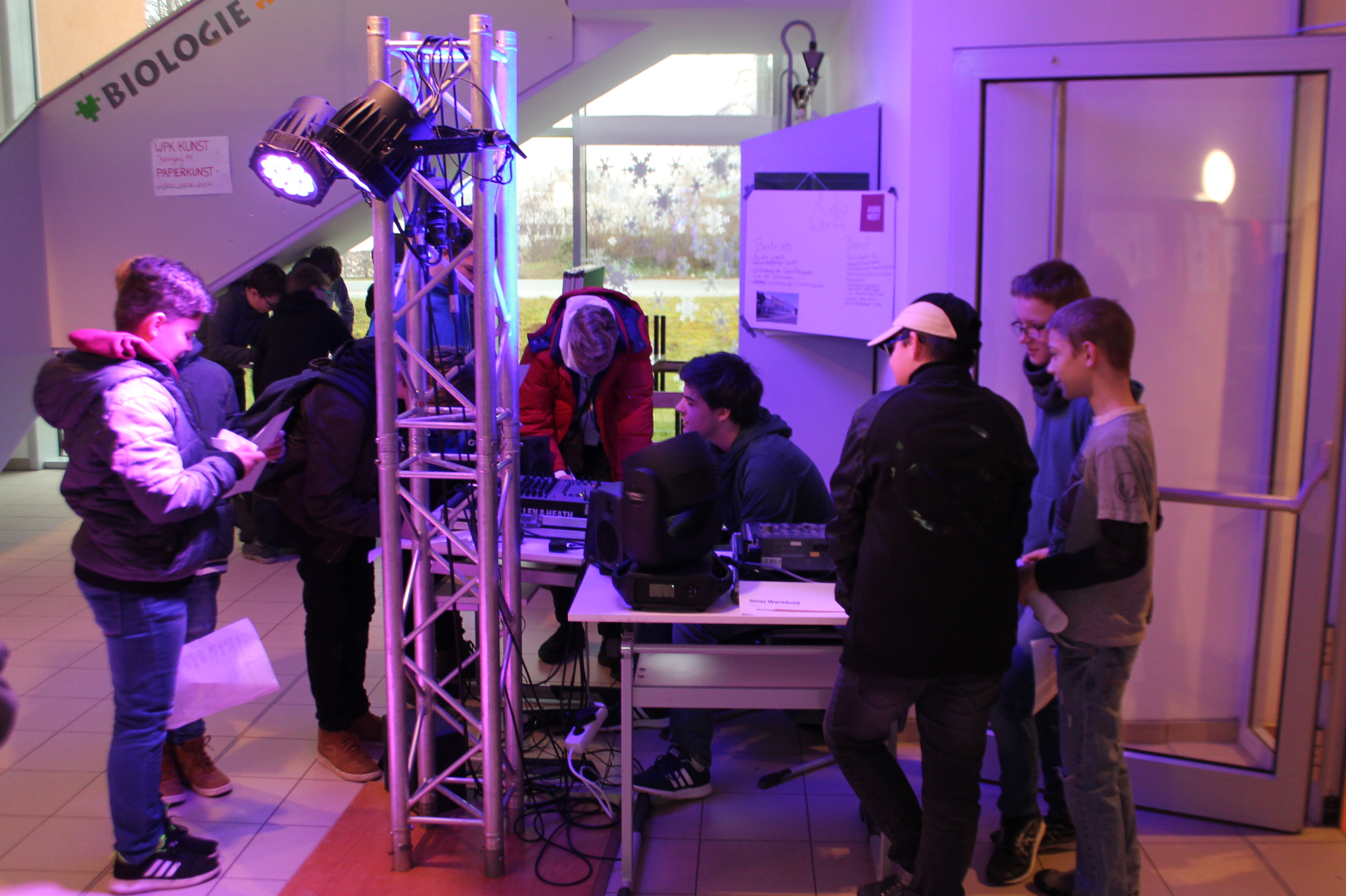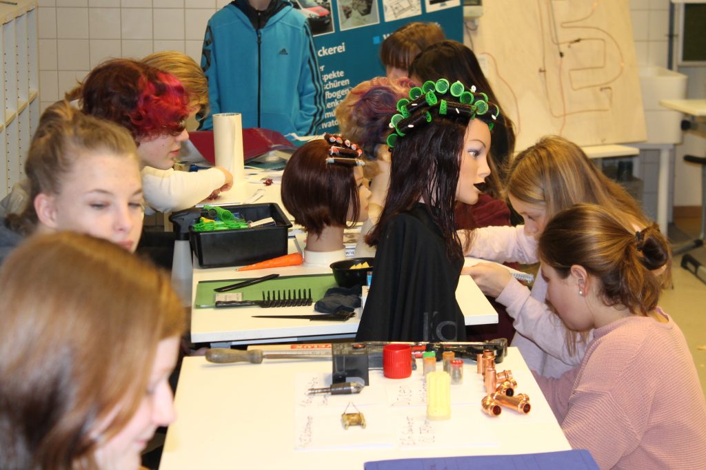 Besonders auf unserer Praktikumsmesse ist, dass es an allen Ständen etwas praktisch auszuprobieren gibt. So wurde auf der Messe gesägt und gehämmert, es wurden Gewinde in Metall geschnitten, Kabel abisoliert, Verbände angelegt, Kuscheltiere geimpft, Handschellen angelegt, Flammkuchen gebacken, ein LED-Moving-Head gesteuert und Kunden hinsichtlich ihres Vermögens beraten. Diese praktische Gestaltung beruflicher Tätigkeiten vermittelt allen Schülerinnen und Schülern einen interessanten ersten Einblick in viele Berufe.
