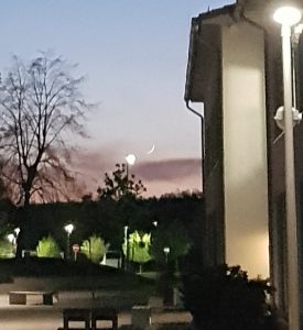 Weiter hinten im Bild ist eine Laterne zu erkennen, die steht etwas über dem Baum. Und dort - gleich rechts - steht die schmale Sichel des Mondes.