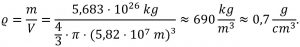 Das Volumen können wir ebenfalls gut schätzen. Wir nehmen einfach an, dass der Planet eine Kugel ist (ist er nicht ganz - da er sich dreht, ist er am Äquator etwas ausgebeult). Seinen Radius kennen wir aus Beobachtungen, damit können wir wieder das Volumen berechnen.