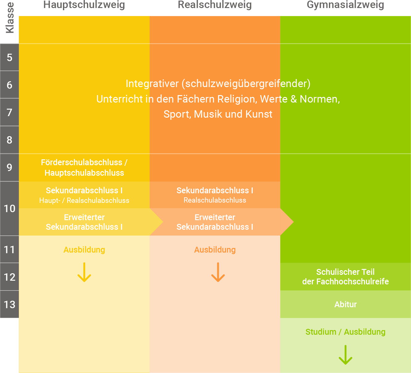 - die Schülerinnen und Schüler in den Fächern Religion, Werte und Normen, Sport, Musik und Kunst in ihren integrativen (schulzweigübergreifenden) Lerngruppen bleiben können;