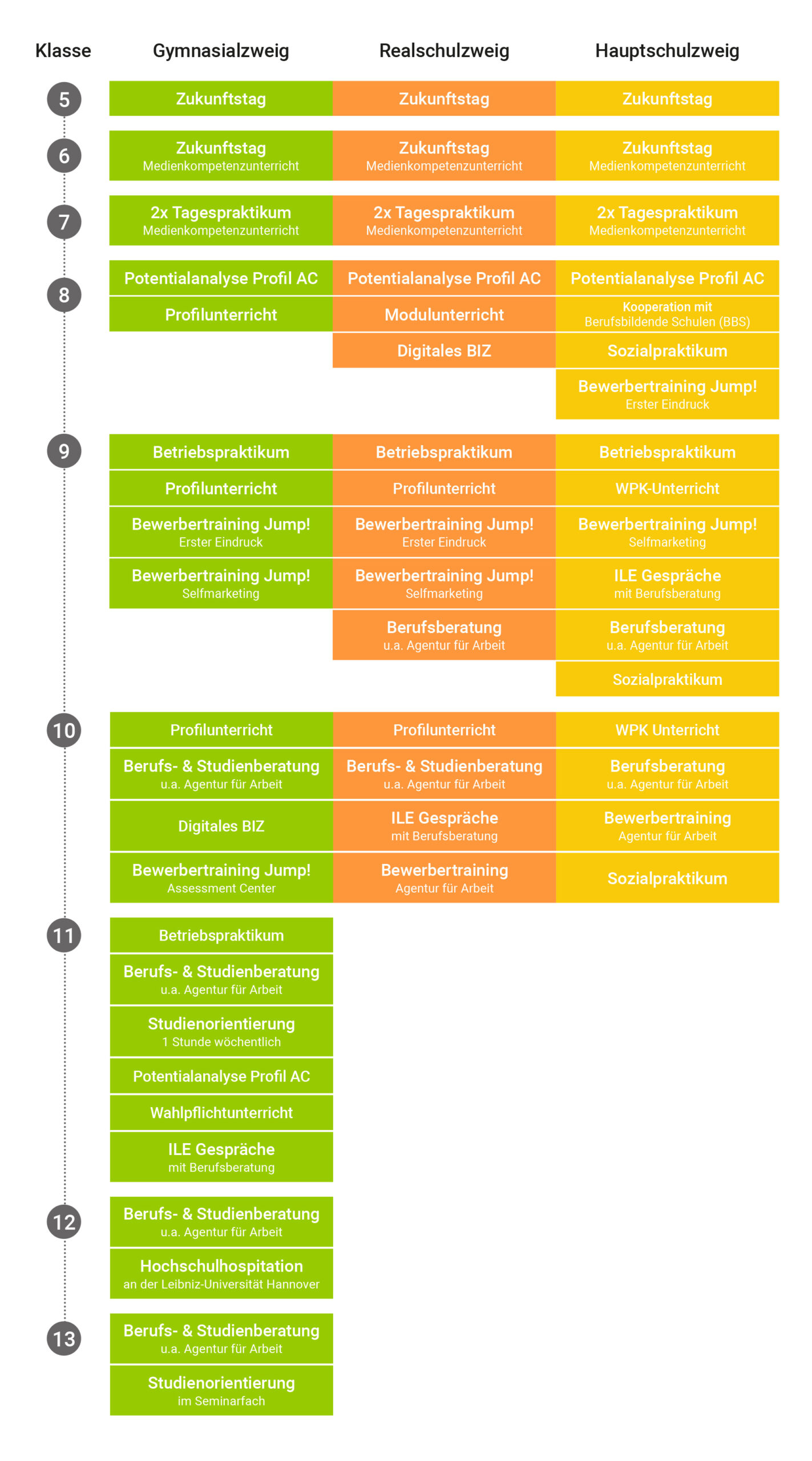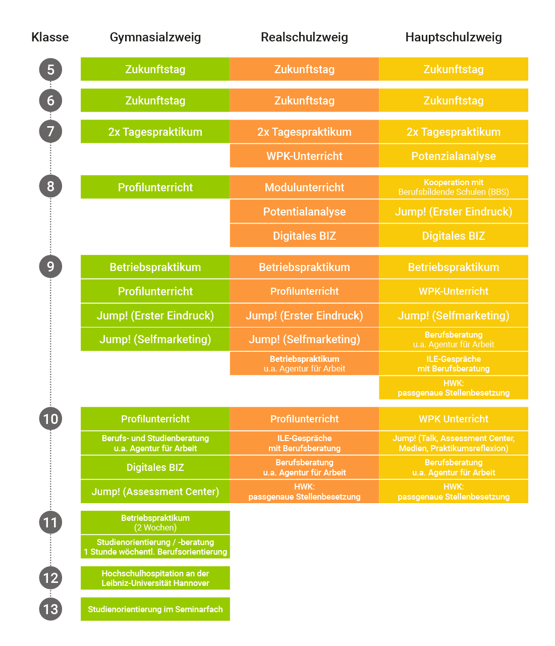Die Schülerinnen und Schüler erwerben z.B. bei den Zukunftstagen, den Tages- und 2- bzw. 3-wöchigen Praktika und auf der Ideen-Expo Einblicke in die konkrete Arbeitswelt. Die Potentialanalysen und die „Jump-Trainings“ oder die Hochschulinformationstage für die Oberstufe helfen ihnen einzuschätzen, welche Fähigkeiten sie haben, um daraus Rückschlüsse für ihre Berufswahl zu ziehen.