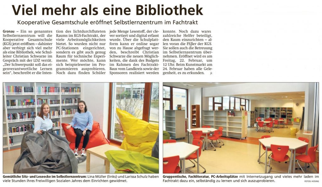 Ab sofort können Bücher aller Art für zwei Wochen entliehen werden. Das Selbstlernzentrum bietet ein vielseitiges Angebot, um den Fachunterricht zu ergänzen oder zu vertiefen. Aber auch jede Menge Romane und interessante Lektüre, die in der Freizeit gelesen werden können. Zudem gibt es hier die Möglichkeit, an drei PC eigenständig zu recherchieren.