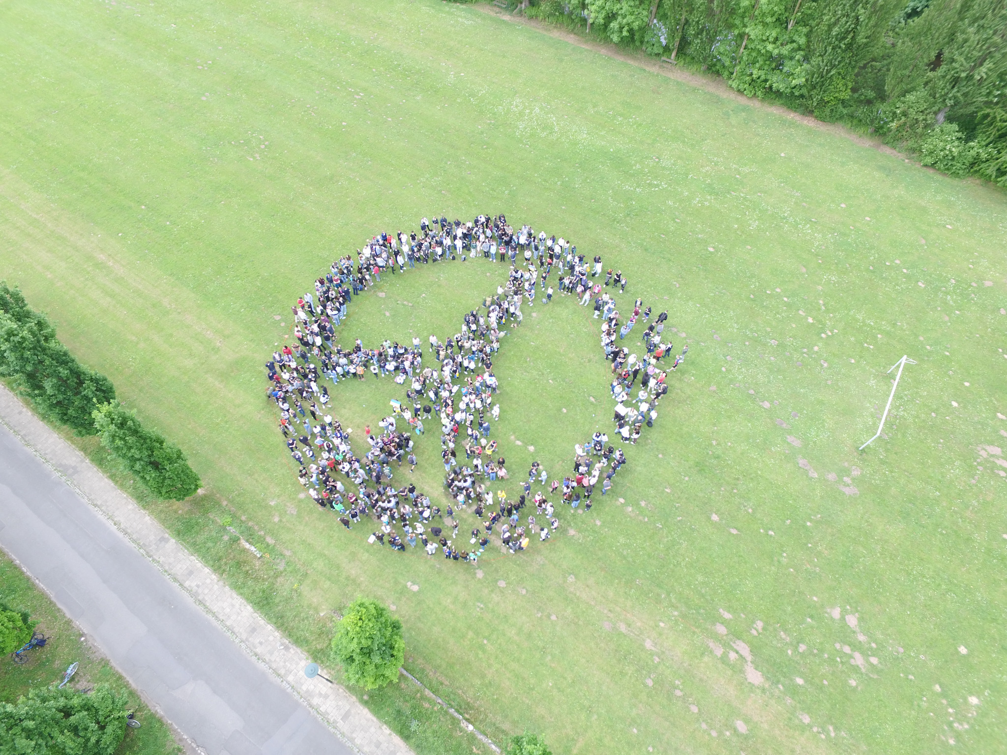 Am 23.05.22 versammelten sich mehr als 800 Schülerinnen und Schüler der KGS Gronau, um zusammen mit ihren Lehrkräften das „Peace“-Symbol als Zeichen für den Frieden zu bilden. „Der Anlass für diese Aktion ist, dass am 24.05. seit drei Monaten Krieg in der Ukraine geführt wird. Der russische Angriff auf die Ukraine ist ein klarer Verstoß gegen das Völkerrecht und bringt – wie jeder Krieg – unglaubliches Leid für die Zivilbevölkerung. Deshalb setzen wir gemeinsam ein Zeichen für den Frieden,“ so die Organisatoren, Herr Kühnel und Frau Eberl.